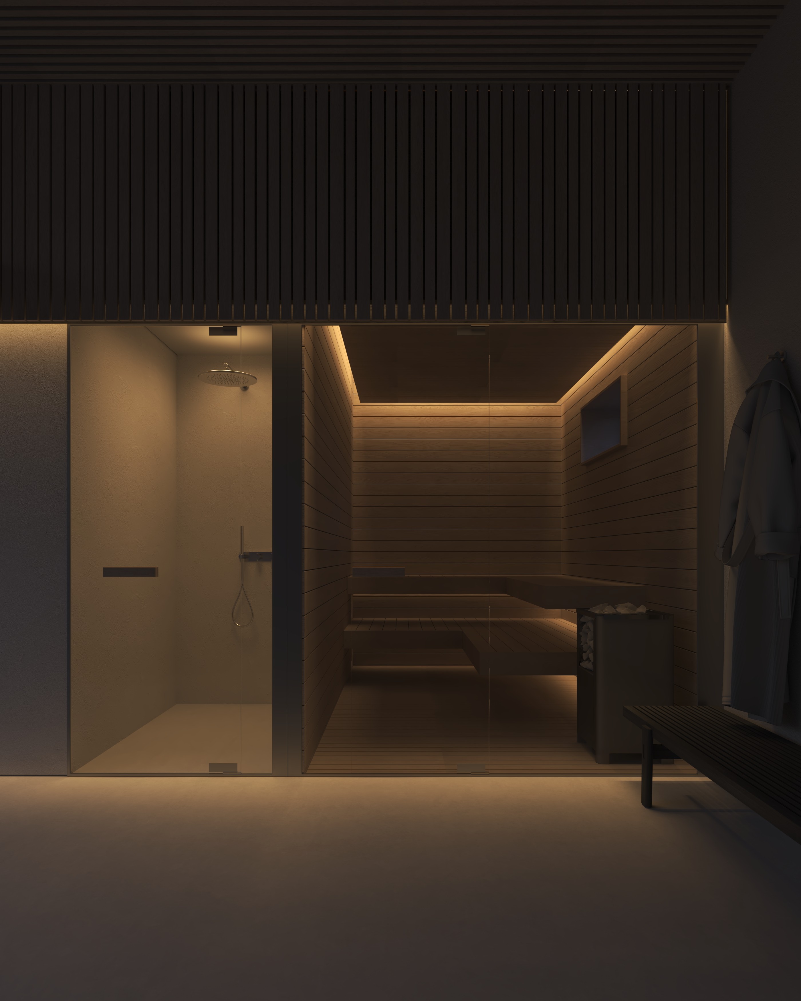 ⁃ мы использовали микроцемент на полу и натуральный шпон на стенах и в мебели. это сочетание подчеркивает чистоту линий и монументальность архитектурных решений.